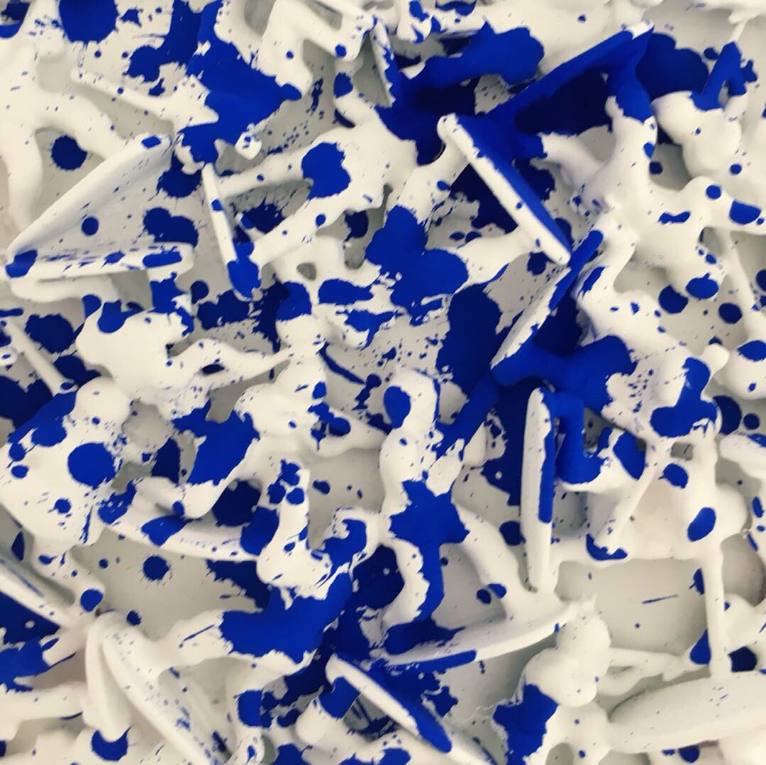 The army of miniature soldiers Hamer bought especially for this artwork. The spectators should discover the madness of war themselves. The viewers with attention to details and those with historical knowledge will understand the symbolism of the blue paint on the piece. Hamer: “Blue is the colour of power. Someone of royal descent has blue blood. The uniforms of Napoleon’s army were also blue.”